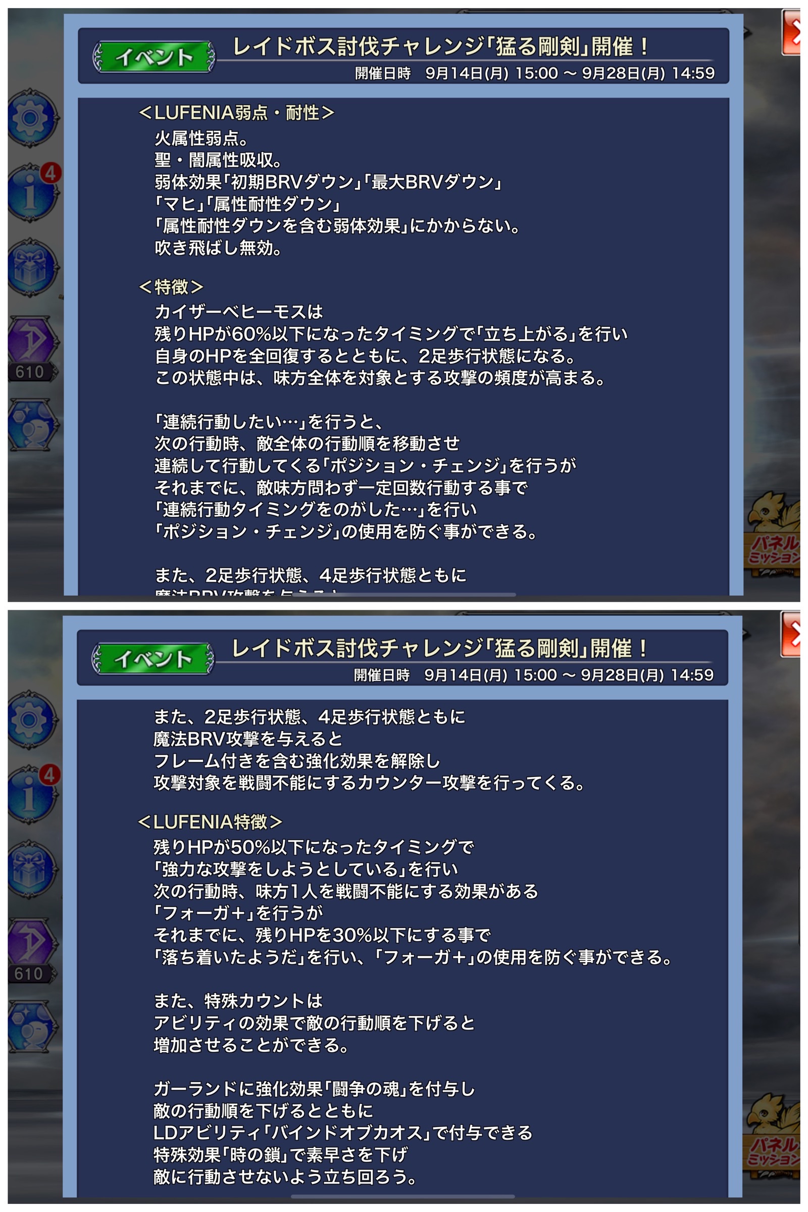 今回のボスは基本的にレオンハルト接待のようです。というか、このゲームって9組に何か恨みでもあるのかってレベルで9組の真化は微妙なのが多いですねえ…。有用そうなのはガーネットとフライヤとベアトリクスくらいだろうか。今回のビビは正直、現環境でコレはアリなの?ってレベルで塩真化だったので気の毒になりました。初期メンなのに…。