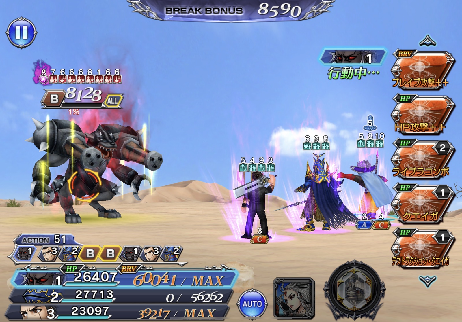 とはいえ、死にさえしなければ回復でOKだし、召喚中に倒せばFA発動しないので大丈夫。厄介なのはそこぐらいで2wave目の大ボスはあんまり脅威を感じませんでした。いやまあ、すげーもっさりした動作なのに1actで3回連続行動してきたときは笑いましたけど、大半が物理攻撃なのでガラフの餌食でしたとも。本当に餌食としか表現しようがなかったです。陛下の回転のこぎりはエアリスからの分配をもらって切れ味抜群のダメージを叩き出していました。ほんと陛下の強さはいぶし銀。