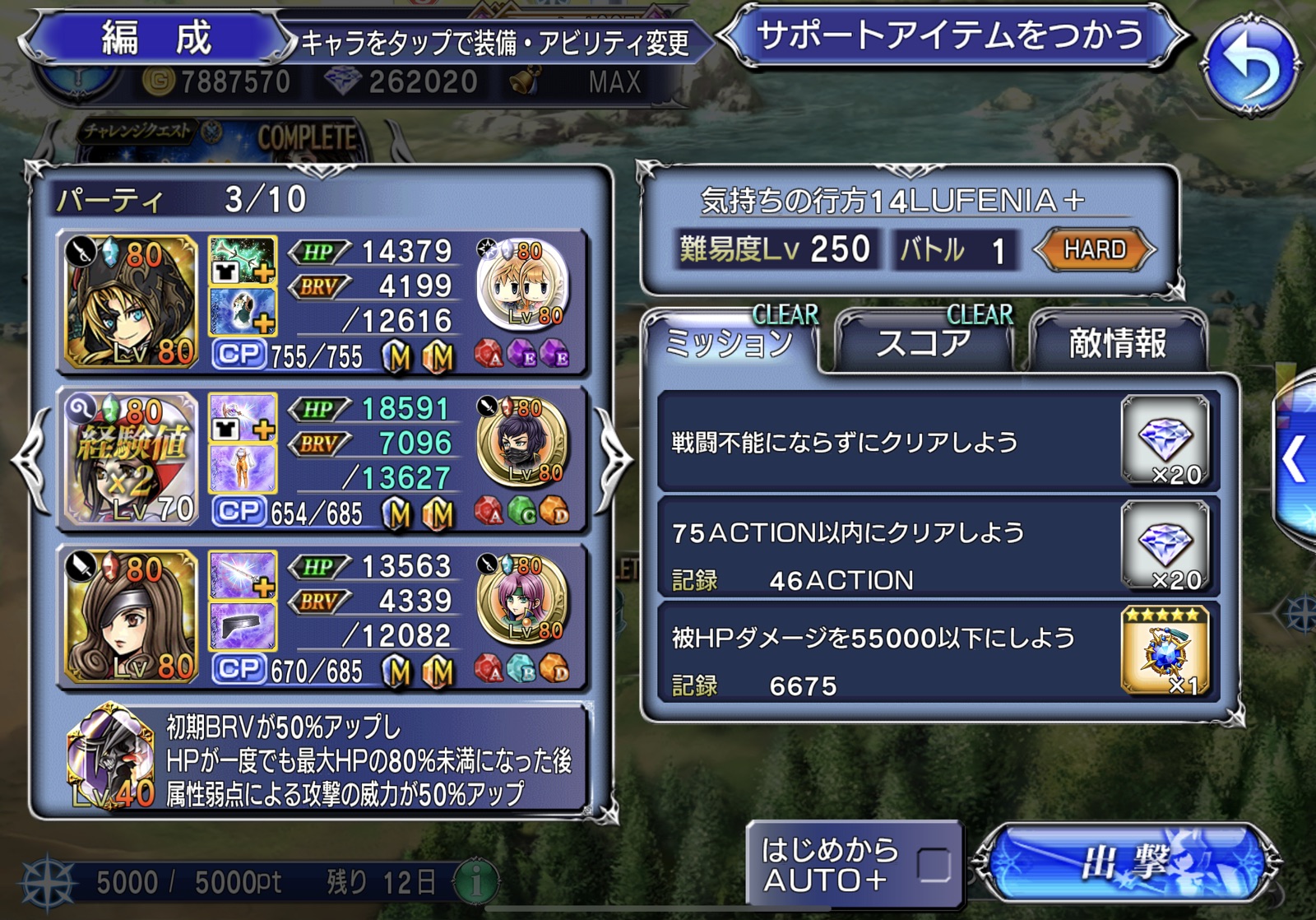 パンネロにすると、リジェネの回復量が大変増えた上に陛下へのBRV供給量も増えたので、かなり安定してダメージが出せました。ローザもすごく優秀なサポーターではあるんですけど、いかんせんHP回復量がスズメの涙なので、HP攻撃の激しいクエストには向かないのが難点ですね。パラセシの回復と合わせても厳しかったです。上手い人はちゃんと使いこなせるんだろうなあ。