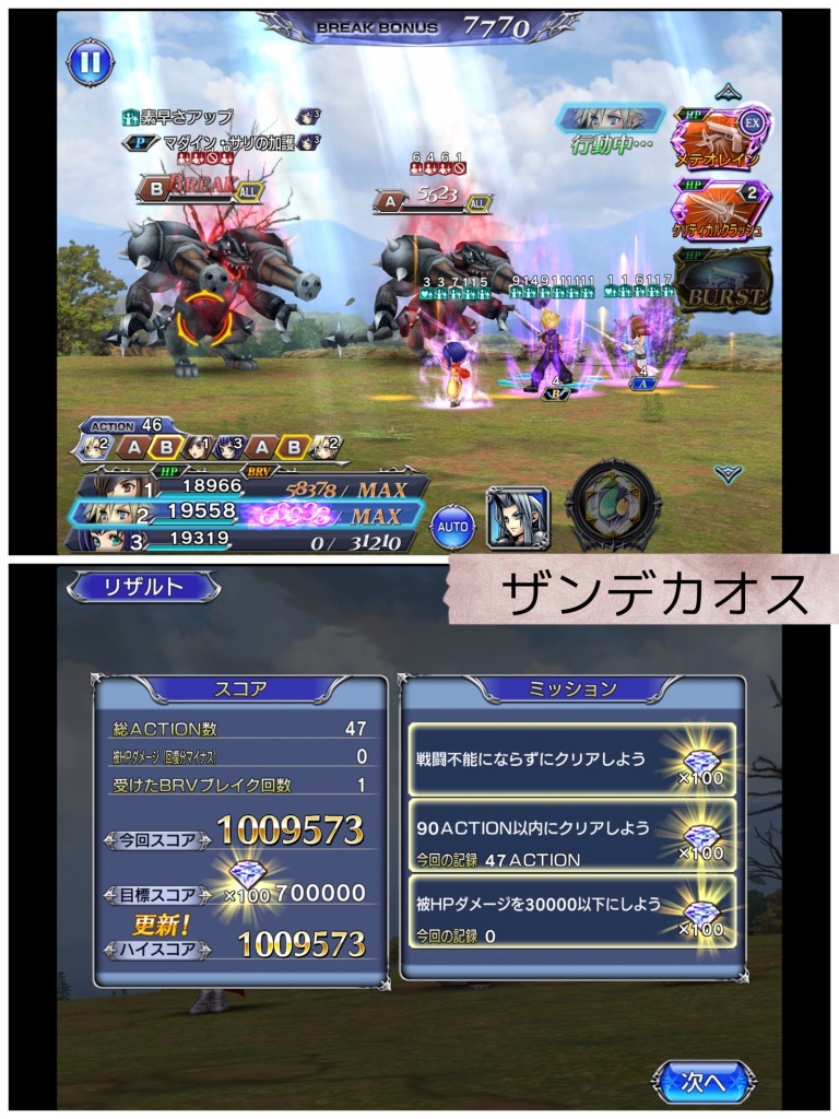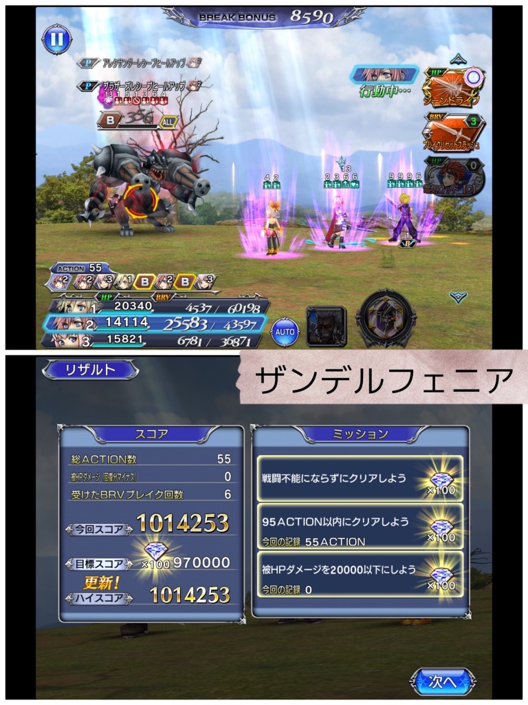 BTタイム中は次にターンが回ってくる敵に麻痺をつけてやり過ごし、BTタイム終了後に即召喚。ロッタも生成解禁して、クラウドは吹き飛ばし、とにかく追い込みます。召喚中に敵が最後っ屁のバリアを張りましたが、ザンデとクラウドの二人がかりで破壊。召喚終了時には、両者ともカウントMAXになっていて、片方はHP2割切っていたと思います。