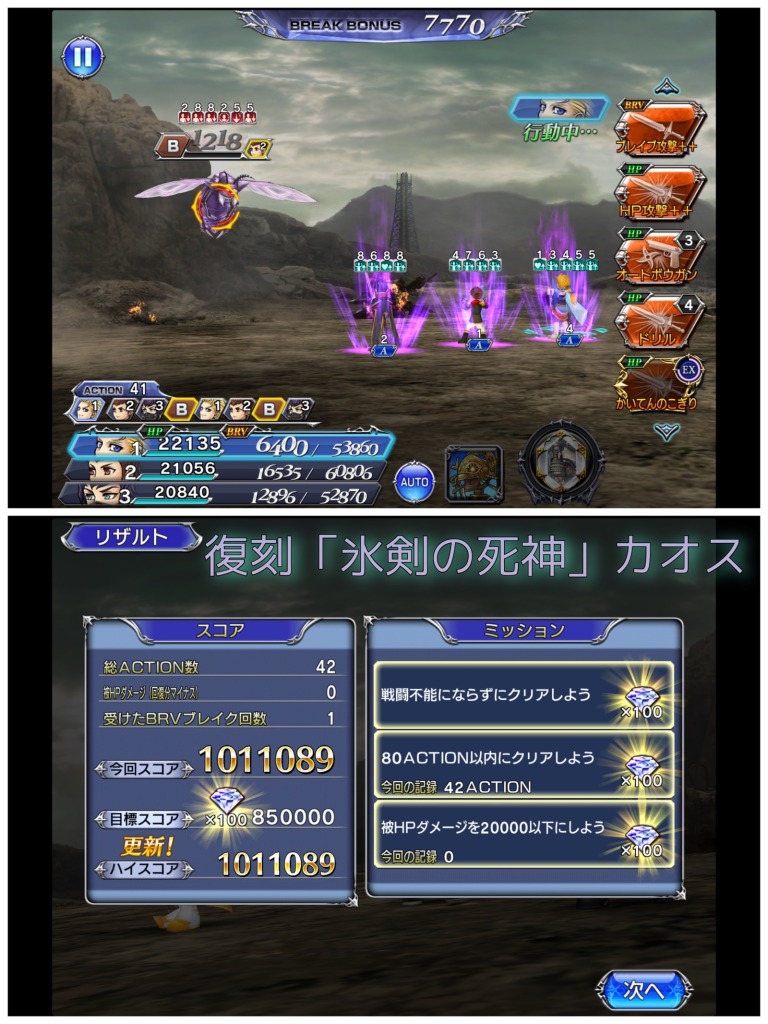 ALL攻撃がHP攻撃なので、通常カオスはアミダさんで敵をあまり動かさないようにしたのですが、そうするとエイトのカウンターが火を吹けず、逆にWoLさんのBTに火を吹いてもらうと陛下は上限突破がないので、おもらし状態になるのが微妙に噛み合ってない感ありました?しかもなぜかALL攻撃は全部陛下だけきっちり食らうという悲しみよ。何で陛下のエヴァージョンは仕事してくれないんです?