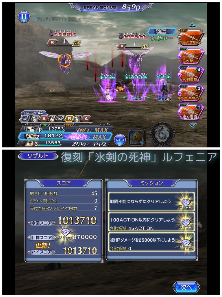 ただ、クラサメ一人では最初のカウント消滅まで止めきれなかったので、片方がカウント1になったところでシヴァ召喚しています。そこでついでにセフィロスとアミダ交代、敵のターンを遥か彼方に追いやっています。その間に次のカウントを出すようにするのですが、カウントが出るまで敵はほぼ行動できていないので、氷牢がいい感じに育っていると思います。カウントが出たらセフィロスBT。
