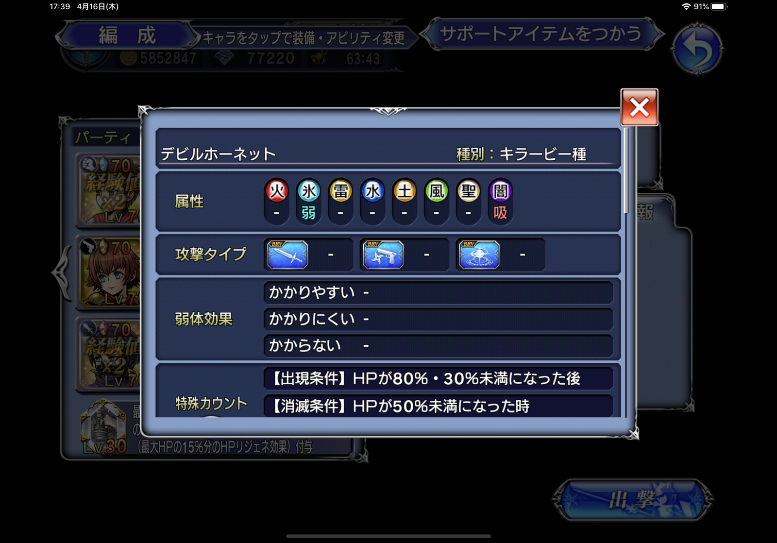 ということで、最近気に入ってるキャラを並べただけという相性もへったくれもないパーティーでコンプしてきました。一応、クラサメはカウントとギミック対策と底上げ用、ベアトリクスはALL攻撃対処用だったのですが、初っ端の連続ALLをセッツァーコールで凌いだ後、聖騎士の守護を使う機会はただの一度もありませんでした…?セフィロスはBGM担当です。とはいえ、一応ちゃんと使いどころは考えたので終盤になってしまいましたが。