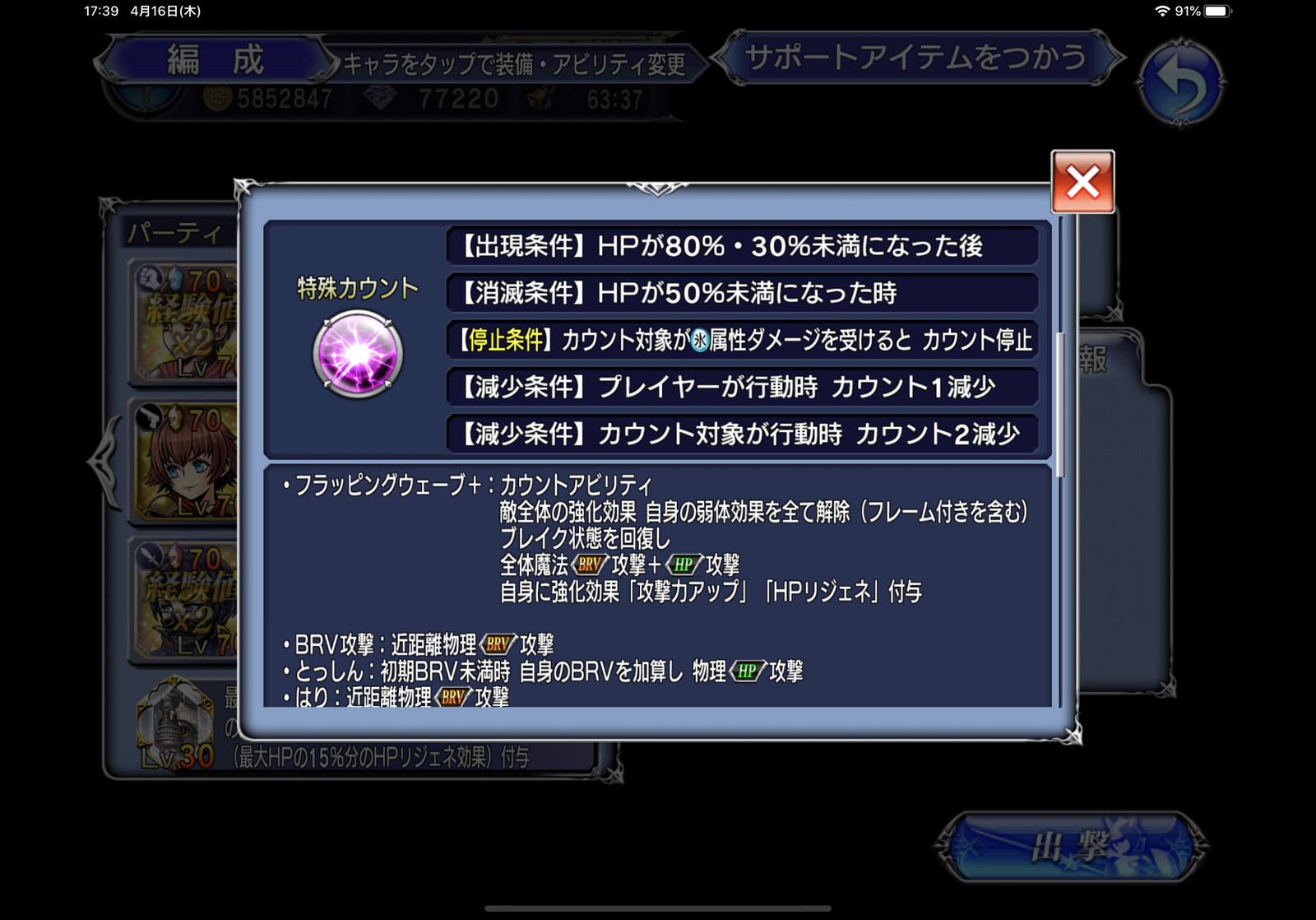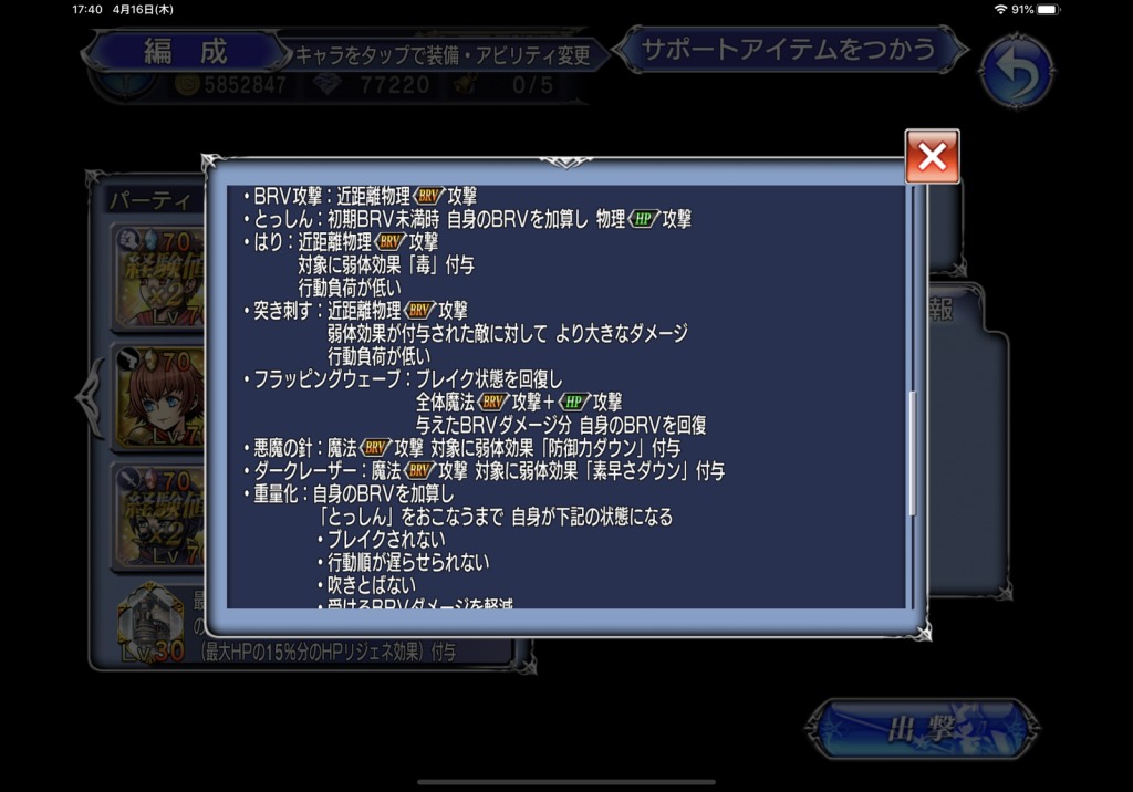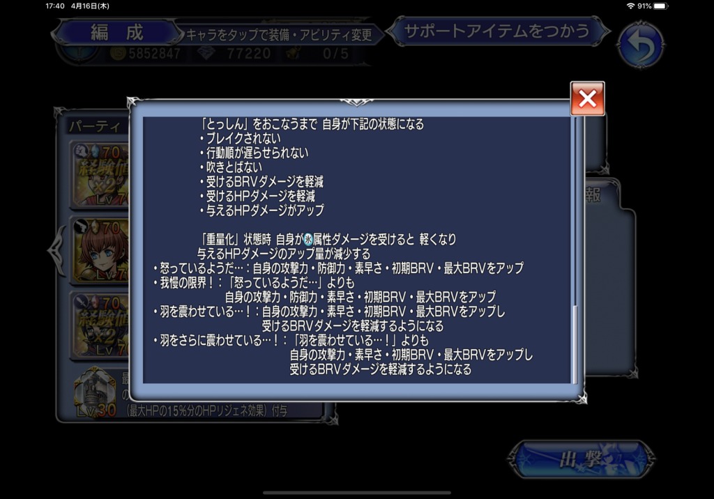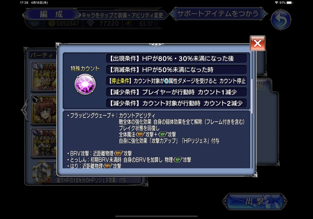 何かまあ相変わらずウダウダ書いてるんですけど、この当時のカウントアビリティって必中じゃないんですよ…。ついでに言えば、BRVダメージ軽減はあるけど、不可視シールドとかないんですよ!!!もう衝撃。「重量化」でモリッとBRV加算されるんですけど、次の敵のターンまでにそれがブレイクできるんですよ!!!今ならモリッとBRV加算するついでに耐久値6万くらいのシールド張った挙句、BRVダメージも5割くらいカットが当たり前になってきてますからね…。