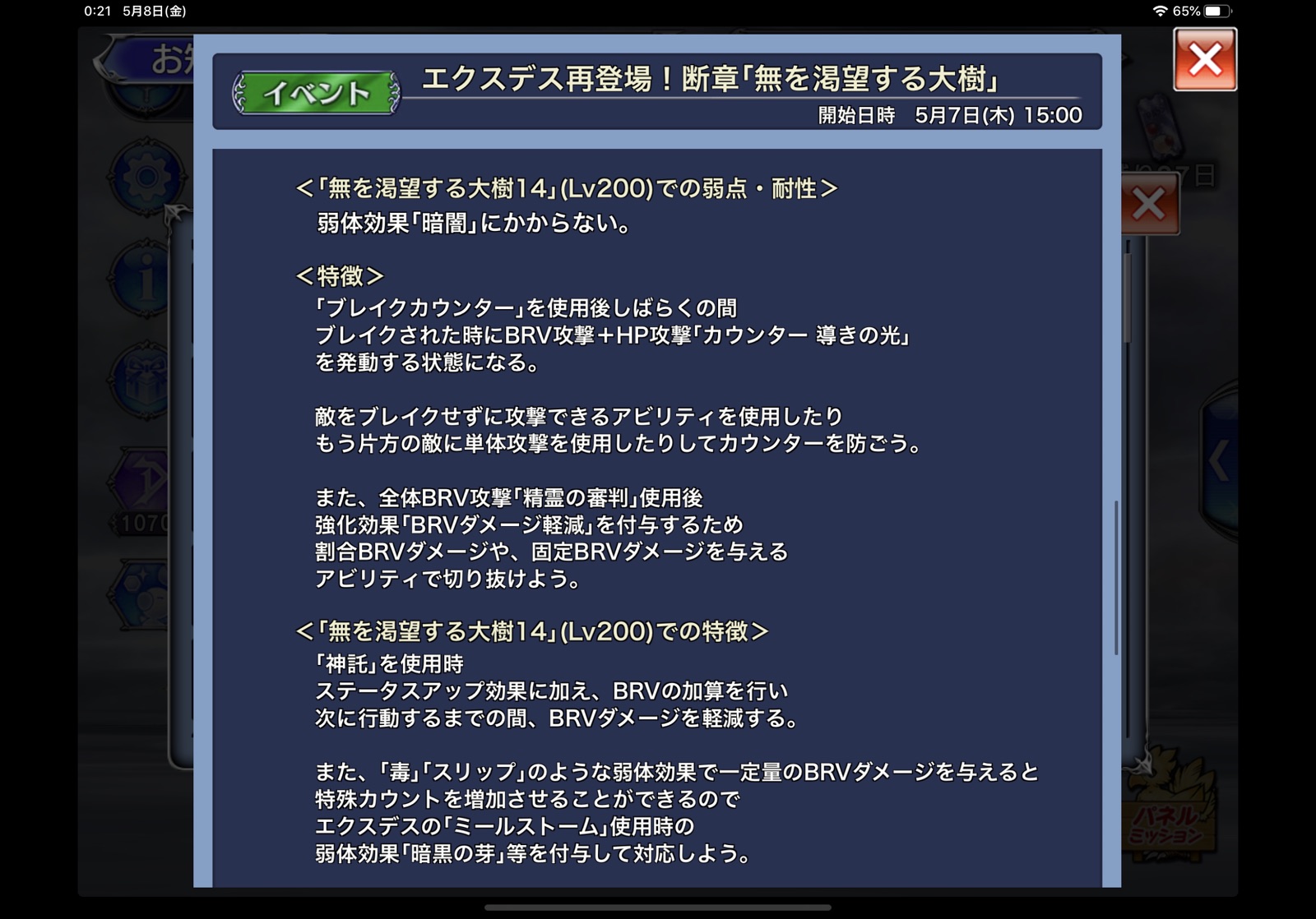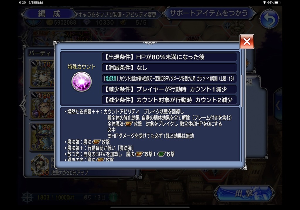 今回はまたしてもカウントの消滅条件がないので、一度出たら何とかカウントを増やしながらHPを削っていかないとなりません。今回のカウント増加条件はデバフでBRVダメージが発生することとガバガバなので、敵は動くと同時にカウントが増えるというやる気あるのかないのかよくわからない感じになっています。それでいいんだよ、わかってるじゃねえか…(セフィロス恩恵期間中のクソギミックトラウマの数々を思い出しながら)