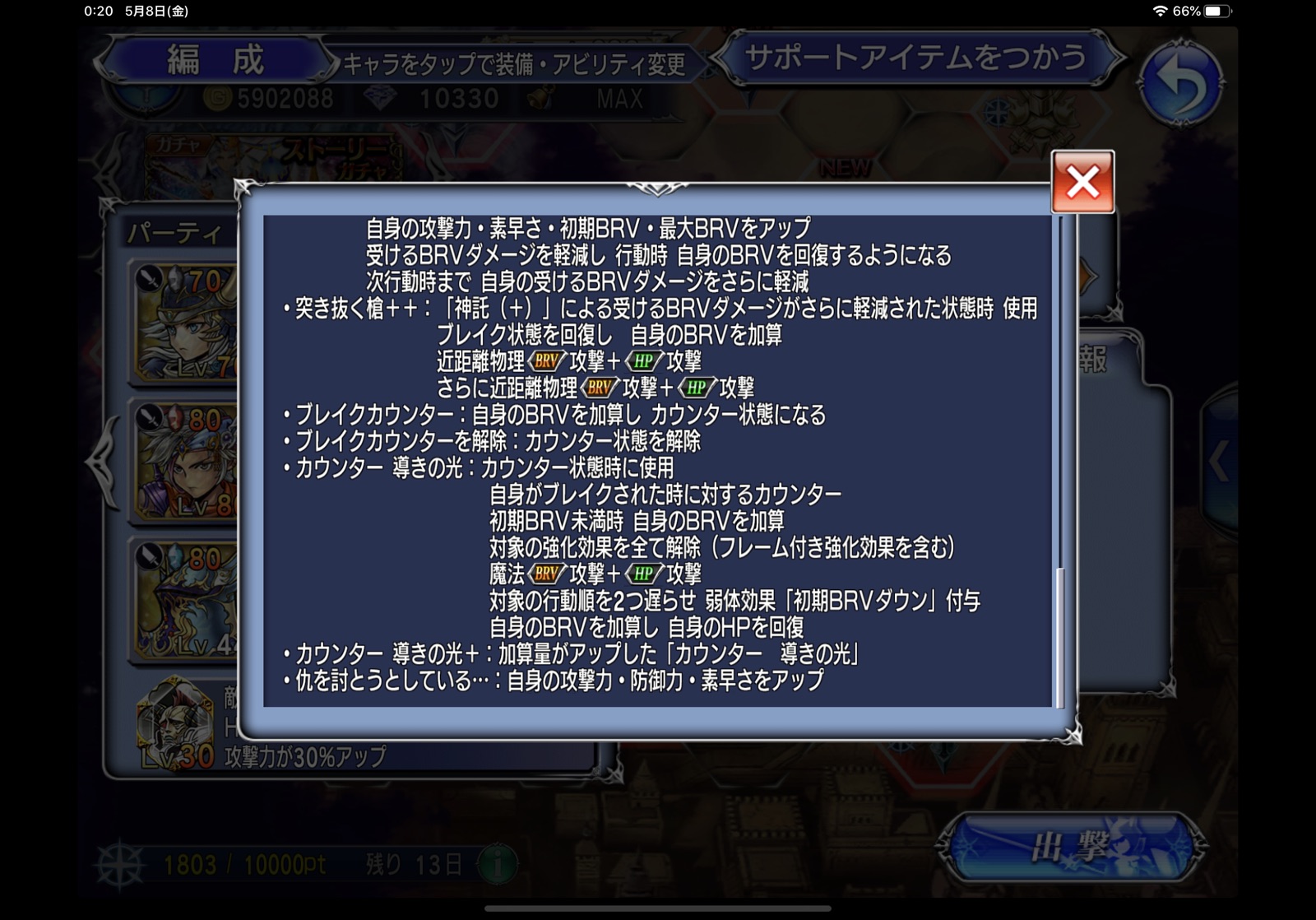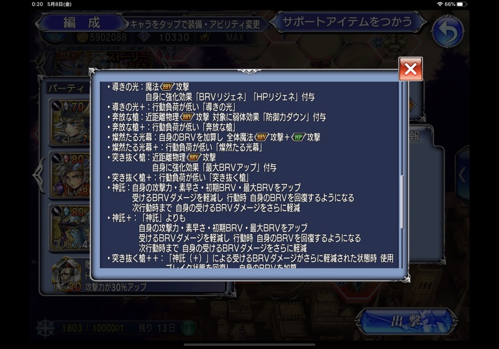 ということで、前回のフリオBT大爆死とGWキャンペーンガチャで毎日コツコツ増やしたパワピとインゴを投入して、即完全体に仕立て上げて差し上げました。今後使うことあるのかなあ…。BTくればまたBGM目当てで重用し始めるかもしれないwだってネオエクスデス戦の曲かっけーもん!!
