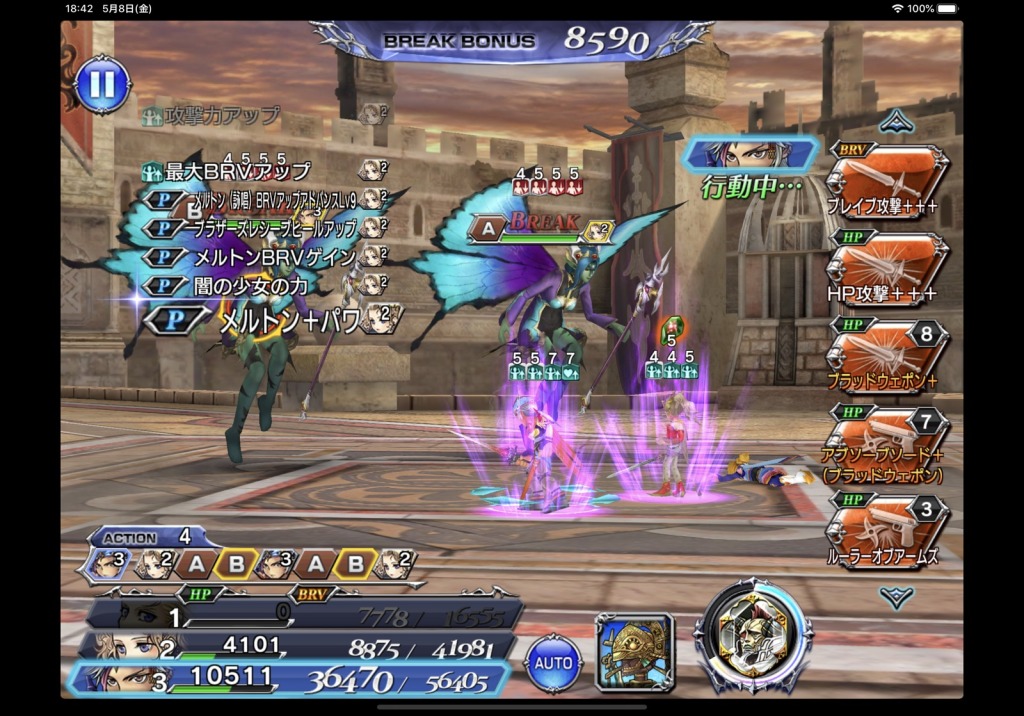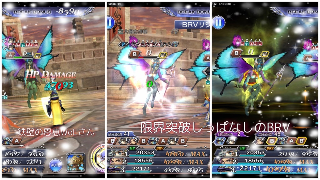 ちなみに、BTはこちらでもフリオのものを使用しました。敵がカウンターモードではないときを見計らう必要はありますが、多分どこで使ってもいいとは思います。一応、フリオのLDアビの節約も兼ねてたし、二度目の神託以降はBRVダメージ軽減が結構あったので分配目的で終盤に使いました。