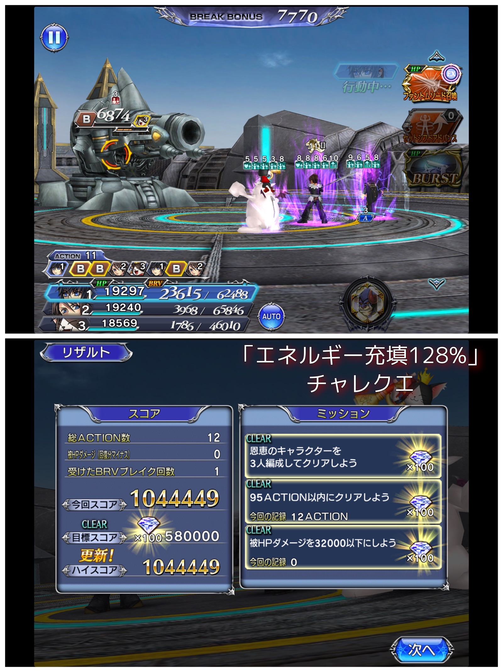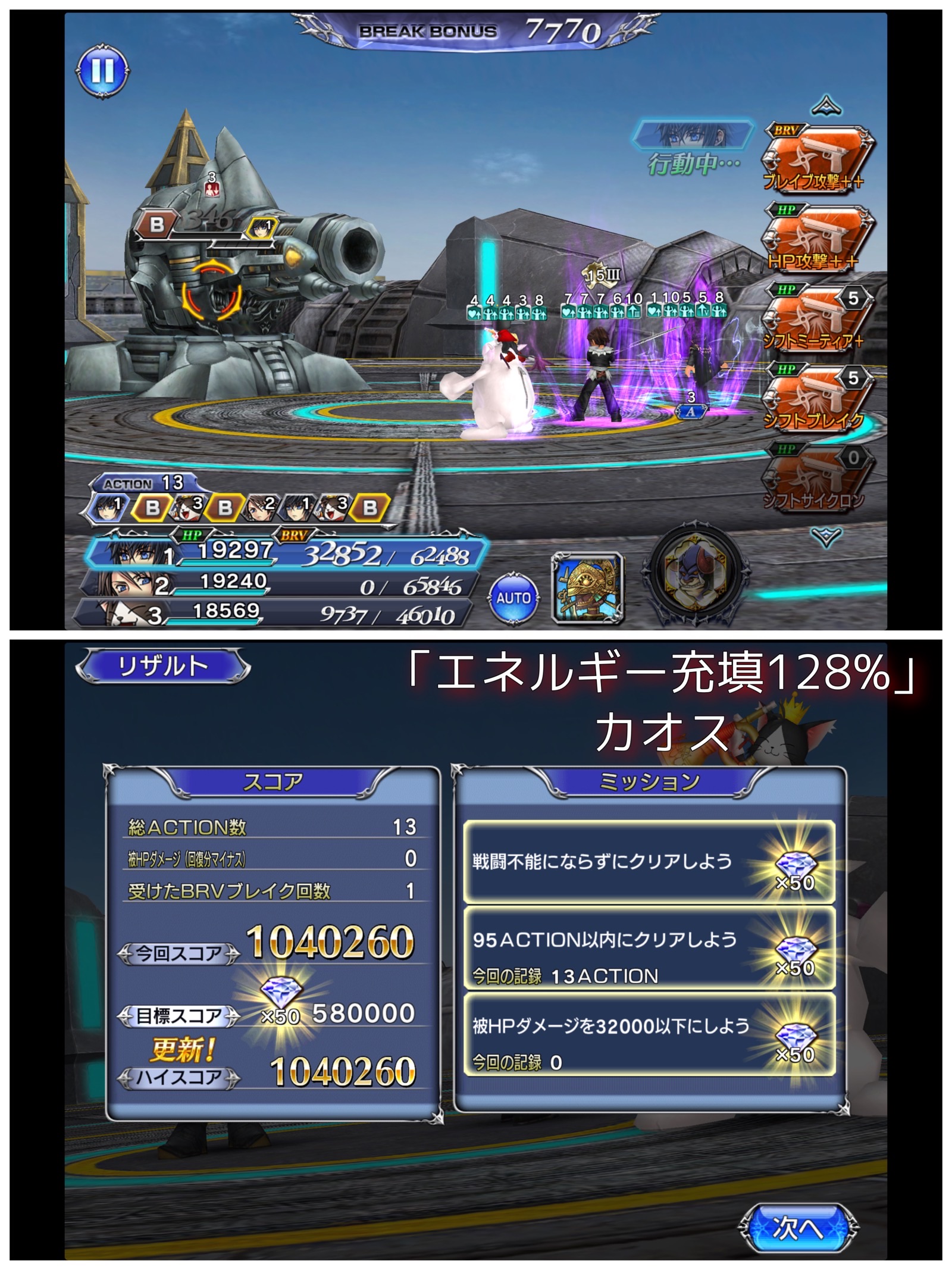 HP攻撃が結構激しい敵なのですが、回復キャラはケット・シー(真化無凸、第一防具のみ)しかおらず、苦戦を強いられそうかなとは思ったのですが、ノクトの割り込み追撃はやっぱり強すぎました。スコールが霞んで見える…。様子見で出撃したときに操作ミスってノクトに老化ミサイルを連チャンで叩き込まれて死んだのは内緒です。