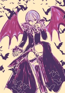それ以前に、ポップンやってたよなんて人がまずいなさそうですね。こんな悪役ヅラしてますがこれは私がこういうふうに描いてるだけで、実際はミスアクションでマイクにおデコぶつけたり、勝利ポーズでドヤってパタパタ飛ぶようなかわいい吸血鬼です。