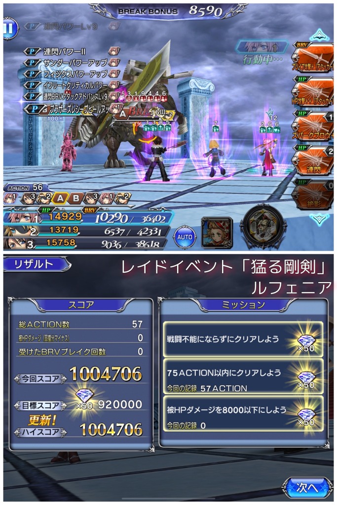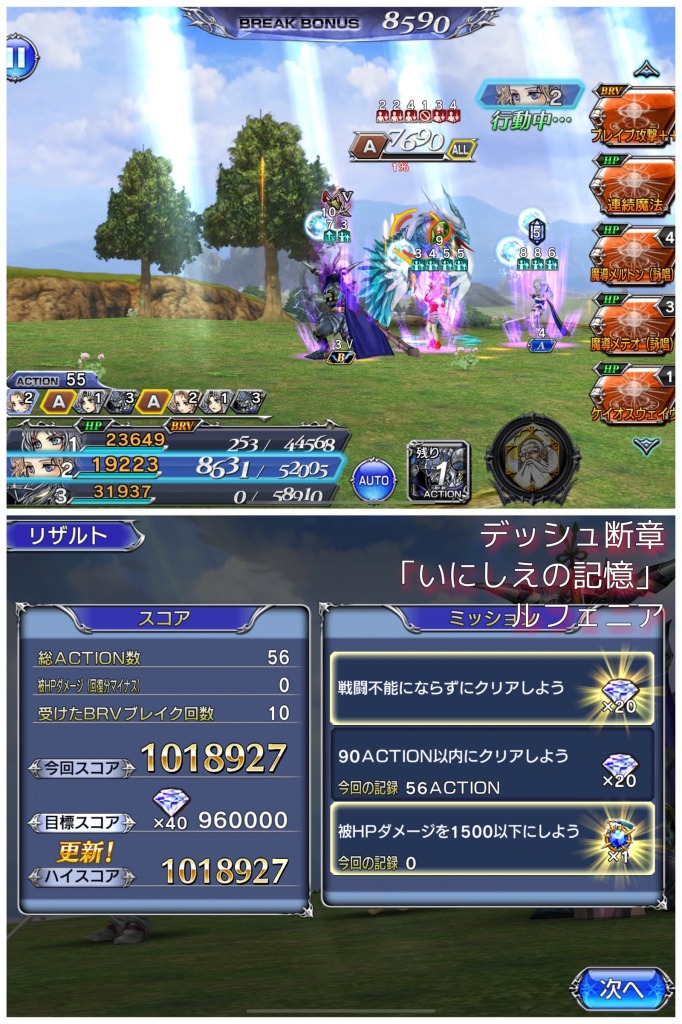 とはいえ、パラセシがいれば耐性ダウンとエンチャントが入れられるし、単純にアタッカーの火力も上げられるのでアビ配分さえ間違わなければカウント消滅以降、セシルが見守る中でティナとヤンが敵をタコ殴りにしてコンプできます。コツはティナのケイオスウェイヴをカウント消滅まで我慢することと、後半は魔導メルトンを主体にすることかなと。
