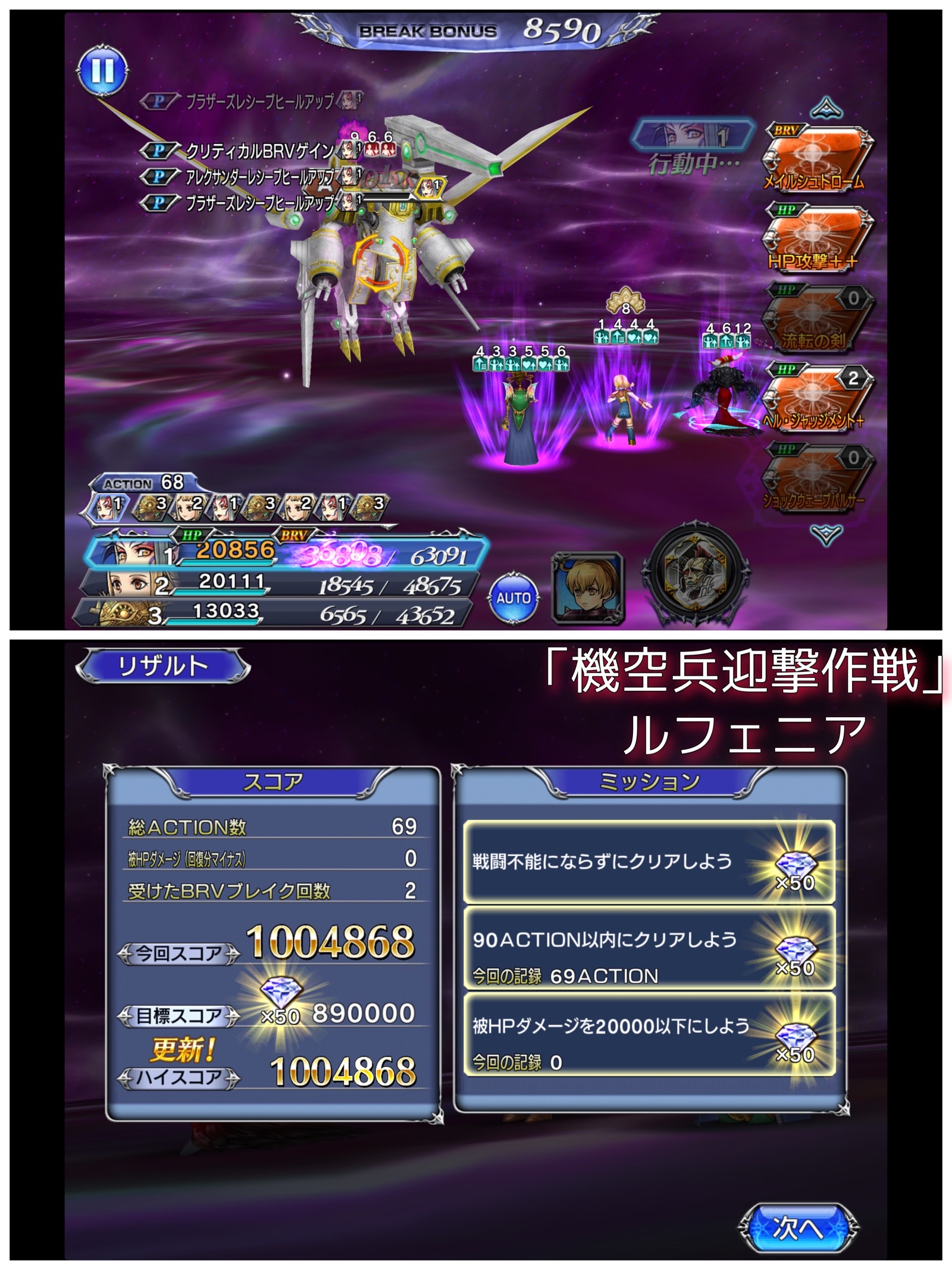 こう書くと何だか難しそうな気がするんですけど、意外とそこまで難しくはないです。まあ、大半は「動かしたらダメなところ」だったりするしな…。フレンド・召喚・BT・コールを総動員しての攻略はなかなか面白かったです。パロムはなるべくブレイクできるように、Aアビ等でブレイク復帰を狙ったり、敢えて攻撃を受けて敵にBRVを稼がせるのもいいかなと思います。