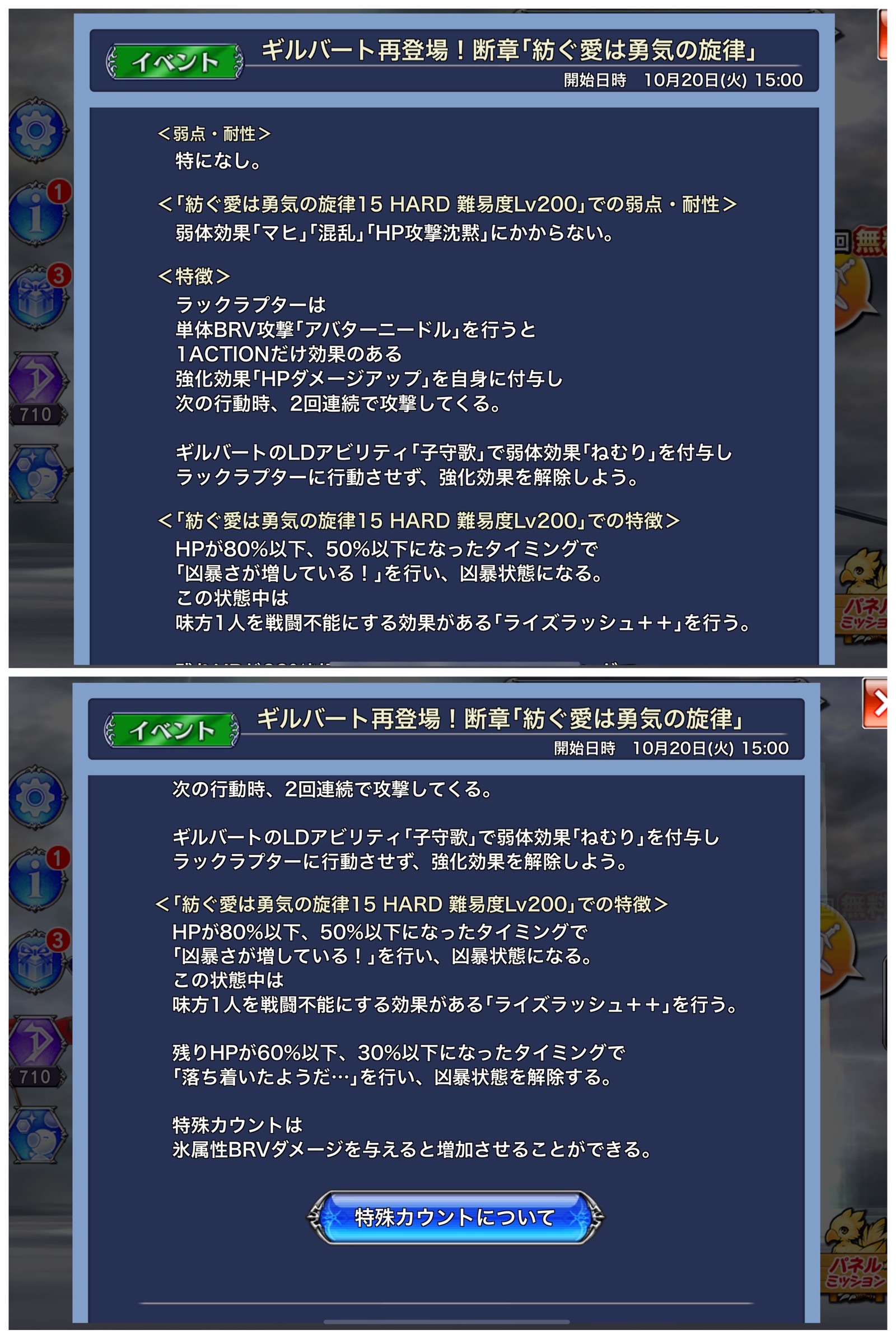 今回は珍しく特に出禁属性がなく、一部の行動不能系デバフは通りませんが遅延・行動順消去・吹き飛ばしが通ります。インフレも一段落ついたってことなんでしょうか。