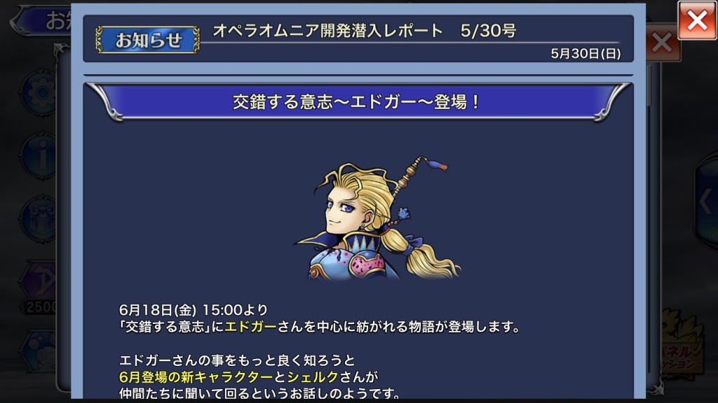 カインのときもそうだったんですけど、「交錯する意志で陛下来たらいいよね~☺️」って友人と語ってたら、本当に来たっていう最高のパターンかよ…。つか、「エドガーさんのことをもっとよく知ろうと(中略)仲間たちに聞いて回る」っていうところ、これテストに出るやつじゃないですか? 陛下のことを一番よくご存知なのは6組の面々ですし、絶対ティナにも聞くやつじゃないですか? 聞かなきゃ嘘でしょ。エドティナ要素の有無は別にしても、ティナが陛下のことを語るという超絶レアイベントとかありそうですやん(第一部でも語ってたけど)