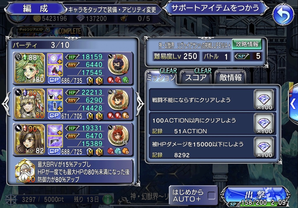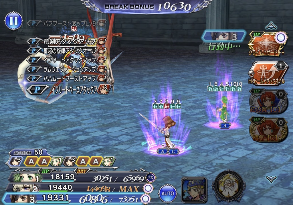 という妄想を膨らませつつ、レイラ入りでもコンプしてきたのですが、BTナシでも真正面から殴り合ってもコンプは可能です。敵のターンが並ぶのでヒヤヒヤするし、お供はほぼ毎ターンHP攻撃してくるので別の意味でもヒヤヒヤするのですが、防御が固まっていれば何とかなります。ベアトリクスの聖騎士の守護が2ターンになったのはありがたいですね。おかげで、リディアのブリンクも合わせれば無傷で凌げることも結構多いです。リディアのエンチャのおかげで、カインも安定して竜剣のダメージが稼げますし、何せ敵のターンが多いから竜剣をいっぱい拝めます。楽しい。
