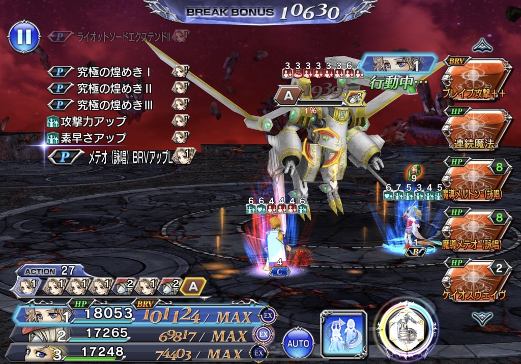 ってことで、引き続き4組チャレンジしてたんですけど、そもそも90覚醒してるのが4人しかいない上に、そのうち暗黒セシルは本領発揮する前にHPが30%切ったら殺すマンの存在のせいでほぼ出禁ですがな…つれぇ…。あと、パラセシのBT真化がまだだったことに私は衝撃を受けたし、物魔混合アビのおかげで真化済ゴル兄さんはどっちの耐性でもダメージが稼ぎにくいという事態にも衝撃を受けました…。いやしかし兄さんのBTアビは赤フレーム回避には役立つんだよなあ…。何とか上手く使いたいです。あと、ポロムちゃんは相変わらず耐性チェンジとか黙ってなさい! で無かったことにしてたので強すぎるなと思いました。