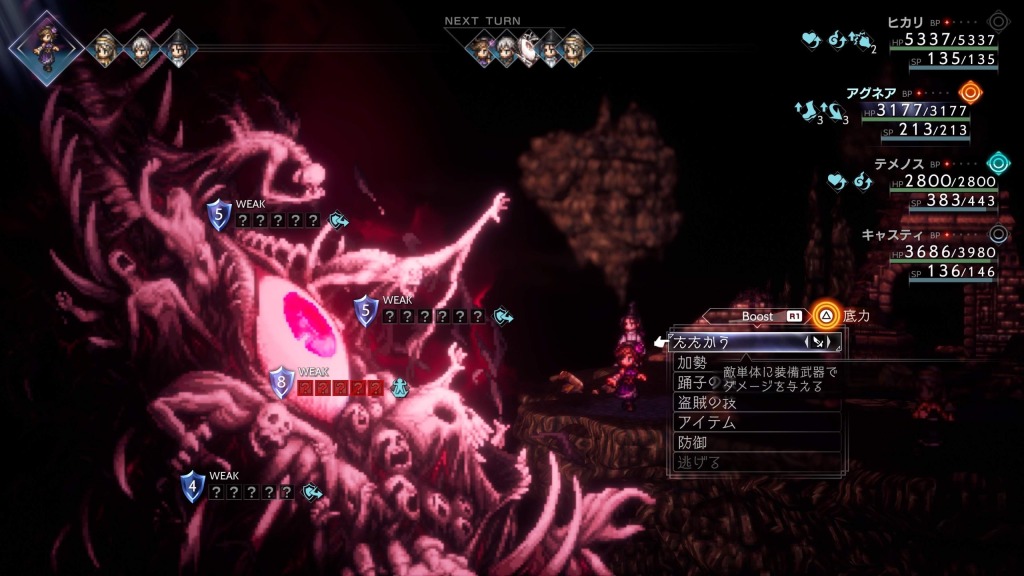 普通にボコられました。何だよ弱点属性以外はカウンターって…しかも一撃がクッソ重い。メインとクロスが終わってサブストーリー行脚をするついでにあちこち回ってたのですが、こんな奴に出くわすとはまさかまさかでした…。初めて未完の隧道行ったときも奥のボスに秒で瞬殺されて「ええ!?」ってなりましたけどね。装備もレベルもだいぶ充実してきたのもあってダンジョンなんか舐めプ状態だったのが思いっきり鼻っ柱折られました。むぐぐ、悔しい。8人全員の総力戦っぽいので、ちゃんと全員育ててメモ片手にリベンジしたいところです(弱点すぐ忘れる)。