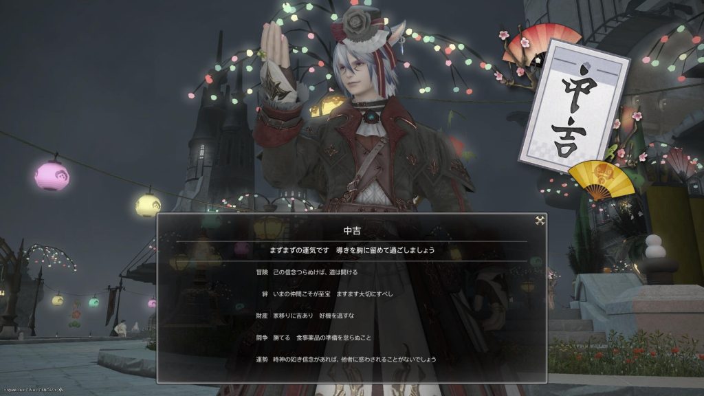 今年も降神祭に行っておみくじを引いてきましたよ…! まあ、イベント内容はほぼ毎年恒例の干支担当のミニオン連れて宣伝する的なやつだったし、面白いNPCが来てるとかでもなさそうだったので割愛。 中吉とか特に面白みもへったくれ