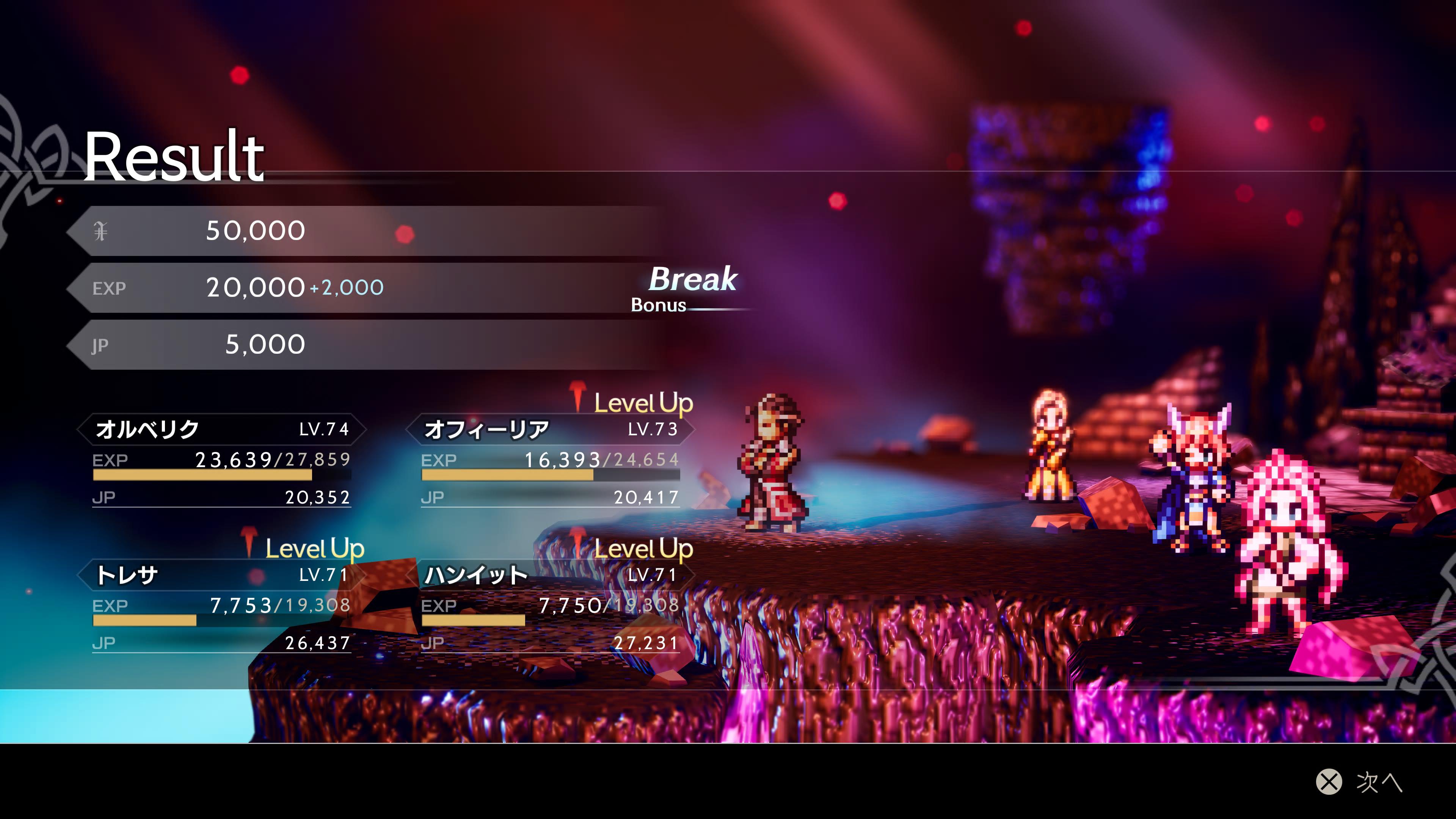 4度目の正直で撃破。オクトラは毎回攻略を一切見ずにプレイしているのですが、裏ボス攻略のために弱点を律儀にメモし、如何にブレイクと火力捻出をし、攻撃への対処をどうするかを考えるのが本当に楽しいです。