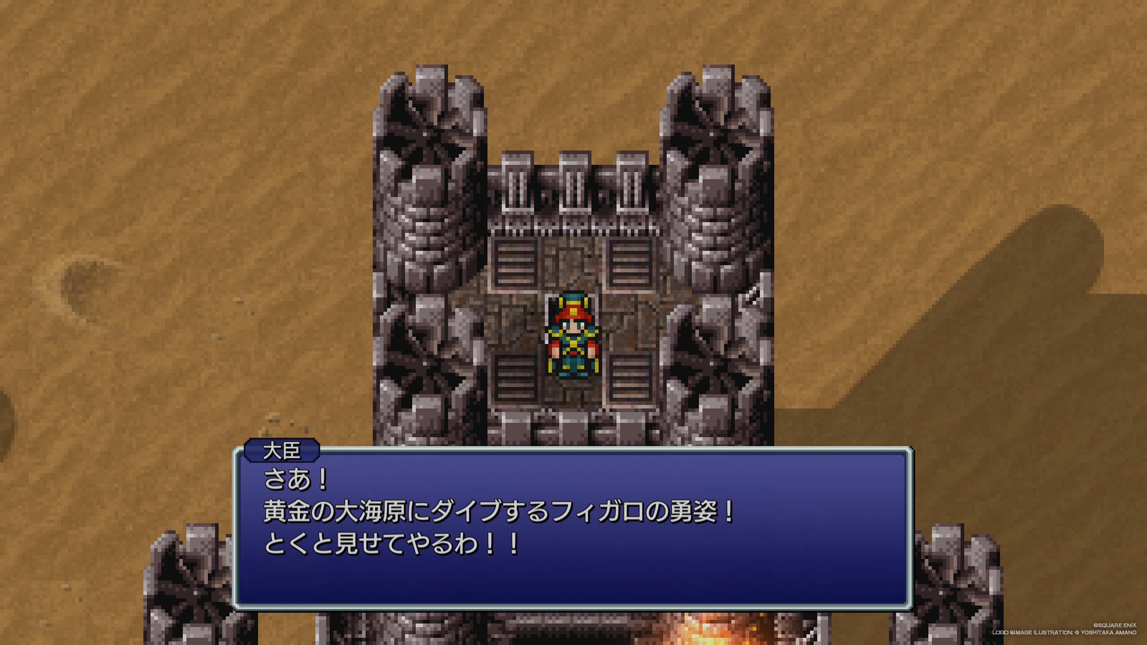 #FF6 オクトラ無印が終わった後ピクリマ版FF1をプレイし、2に行くと見せかけて6を始めました。早速黄金の大海原にダイブするフィガロ城の勇姿を拝み、エドティナを摂取しております…スーハー